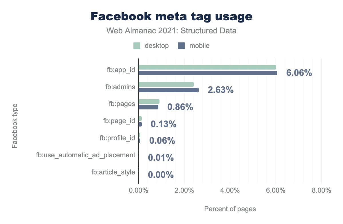 og:title is on 54.87%, og:url is on 52.03%, og:type is on 48.18%, og:description is on 48.55%, og:site_name is on 43.37%, og:image is on 36.98%, og:locale is on 26.39%, og:image:width is on 12.95%, og:image:height is on 12.91%, og:image:secure_url is on 5.61%, og:image:alt is on 1.75%, og:image:type is on 1.61%, og:updated_time is on 1.54%, and og:locale:alternate is on 0.87%. Desktop usage is similar.The most common type of Open Graph tag is the og:title, which can be found on an incredible 54.87% of pages. That’s followed closely by a set of related attributes, which describe what type of thing is being represented (e.g., og:type, on 48.18% of pages) and how it should be represented (e.g., og:description, on 48.55% of pages).