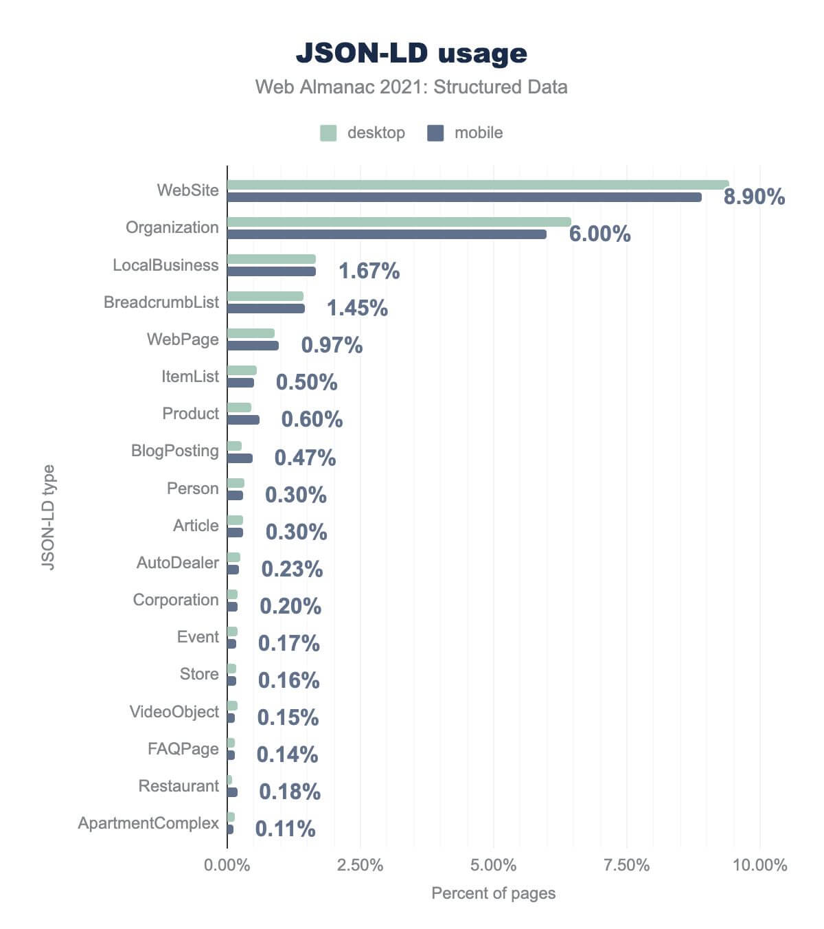 Website is on 8.90%, Organization is on 6.00%, LocalBusiness is on 1.67%, BreadcrumbList is on 1.45%, WebPage is on 0.97%, ItemList is on 0.50%, Product is on 0.60%, BlogPosting is on 0.46%, Person is on 0.30%, Article is on 0.30%, AutoDealer is on 0.23%, Corporation is on 0.20%, Event is on 0.17%, Store is on 0.16%, VideoObject is on 0.15%, FAQPage is on 0.14%, Restaurant is on 0.18%, and ApartmentComplex is on 0.11%. Desktop usage is similar.As we might expect, our findings are similar to our findings from evaluating the use of microdata. That’s to be expanded, as both approaches are heavily skewed towards the use of schema.org as a predominant standard. However, there are some interesting differences.