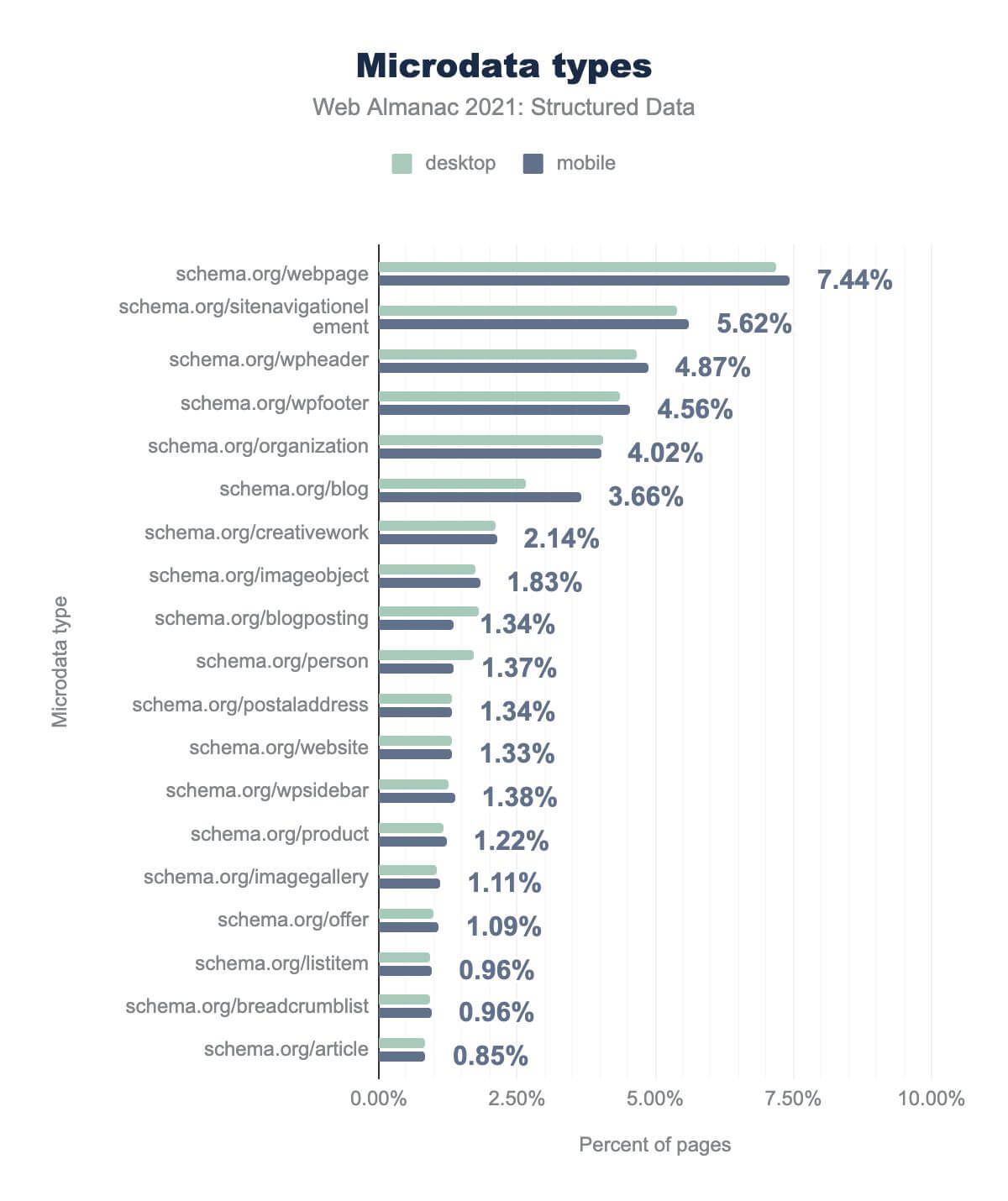 schema.org/ prefix): webpage is on 7.44%, sitenavigationelement is on 5.62%, wpheader is on 4.87%, wpfooter is on 4.56%, organization is on 4.02%, blog is on 3.66%, creativework is on 2.14%, imageobject is on 1.83%, blogposting is on 1.34%, person is on 1.37%, postaladdress is on 1.34%, website is on 1.33%, wpsidebar is on 1.38%, product is on 1.22%, imagegallery is on 1.11%, offer is on 1.09%, listitem is on 0.96%, breadcrumblist is on 0.96%, and article is on 0.85%. Desktop usage is similar.The most common types of microdata across the pages we analyzed describe the web page itself; via properties like webpage (7.44% of pages), sitenavigationelement (5.62% of pages), wpheader (4.87% of pages) and wpfooter (4.56% of pages).