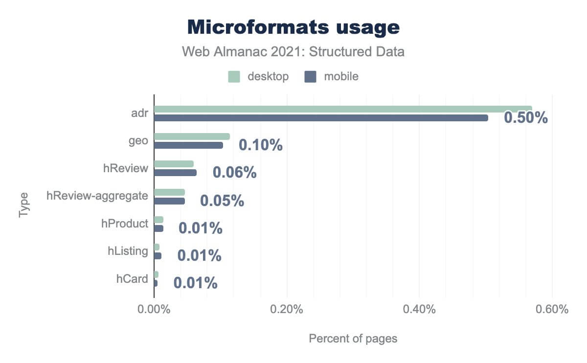 adr is on 0.50%, geo is on 0.10% hReview is on 0.06% hReview-aggregate is on 0.05% hProduct is on 0.01% hListing is on 0.01%, and hCard 0.01%. Desktop usage is similar.Historically and due to its nature (as an extension of HTML), Microformats have been heavily used by website developers to describe properties of businesses and organizations; particularly in pages promoting local businesses. This goes a long way to explaining the prominence of the adr property (on 0.50% of pages), reviews (hReview, on 0.06% of pages) and other information meant to characterize local businesses and their products/services.
