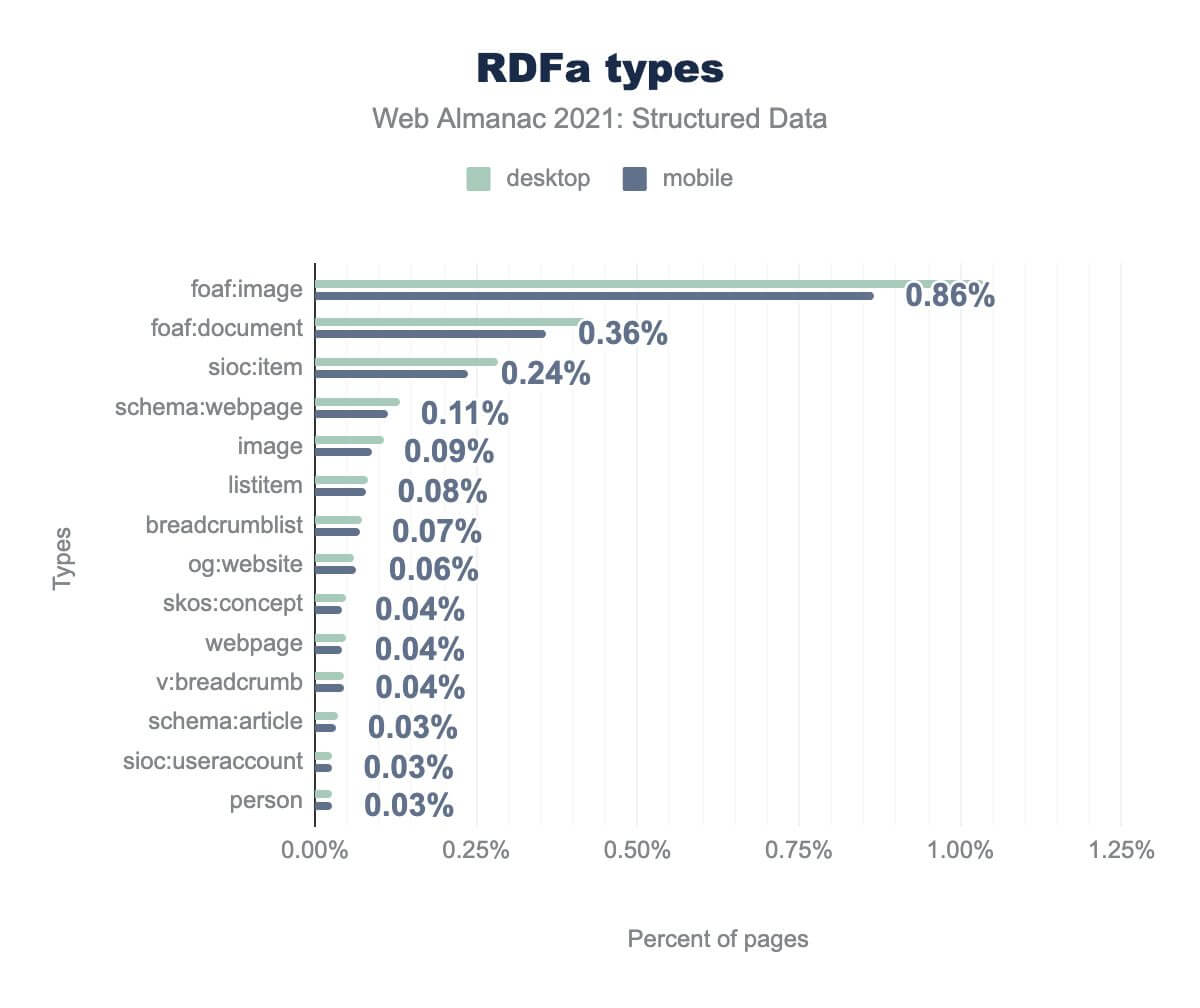 foaf:image is on 0.86%, foaf:document is on 0.36%, sioc:item is on 0.24%, schema:webpage is on 0.11%, image is on 0.9%, listitem is on 0.08%, breadcrumblist is on 0.07%, og:website is on 0.06%, skos:concept is on 0.04%, webpage is on 0.04%, v:breadcrumb is on 0.04%, schema:article is on 0.03%, sioc:useraccount is on 0.03%, and person is on 0.03%. Desktop usage is similar.When we evaluate the types of RDFa, we can see that the foaf:image syntax is present on far more pages than any other type—on upwards of 0.86% of all pages in our data set. Whilst that may seem like a small proportion, it represents over ~65,000 pages, and over 60% of the total RDFa markup that we discovered.