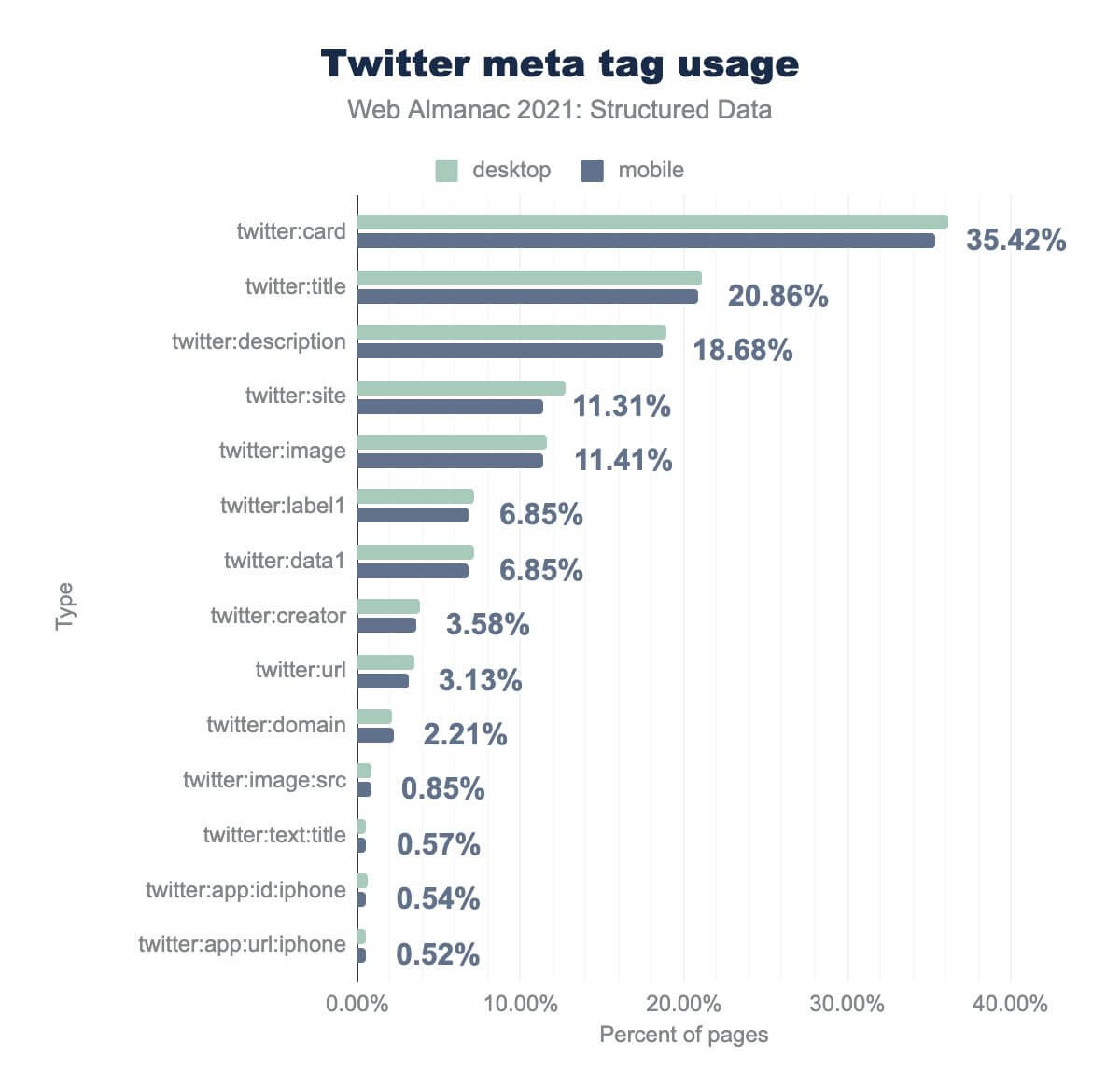 twitter:card is on 35.42%, twitter:title is on 20.86%, twitter:description is on 18.68%, twitter:site is on 11.31%, twitter:image is on 11.41%, twitter:label1 is on 6.85%, twitter:data1 is on 6.85%, twitter:creator is on 3.58%, twitter:url is on 3.13%, twitter:domain is on 2.21%, twitter:image:src is on 0.58%, twitter:text:title is on 0.57%, twitter:app:id:phone is on 0.54%, and twitter:app:url:iphone is on 0.52%. Desktop usage is similar.The most common Twitter meta tag is twitter:card, which was found on 35.42% of all pages. This tag can be used to define how pages should be presented when shared on the platform (e.g., as a summary, or as a player when paired with additional data about a media object).
