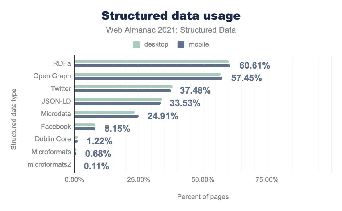 At the other end of the scale, legacy formats, like Microformats and microformats2, appear on fewer than 1% of pages.