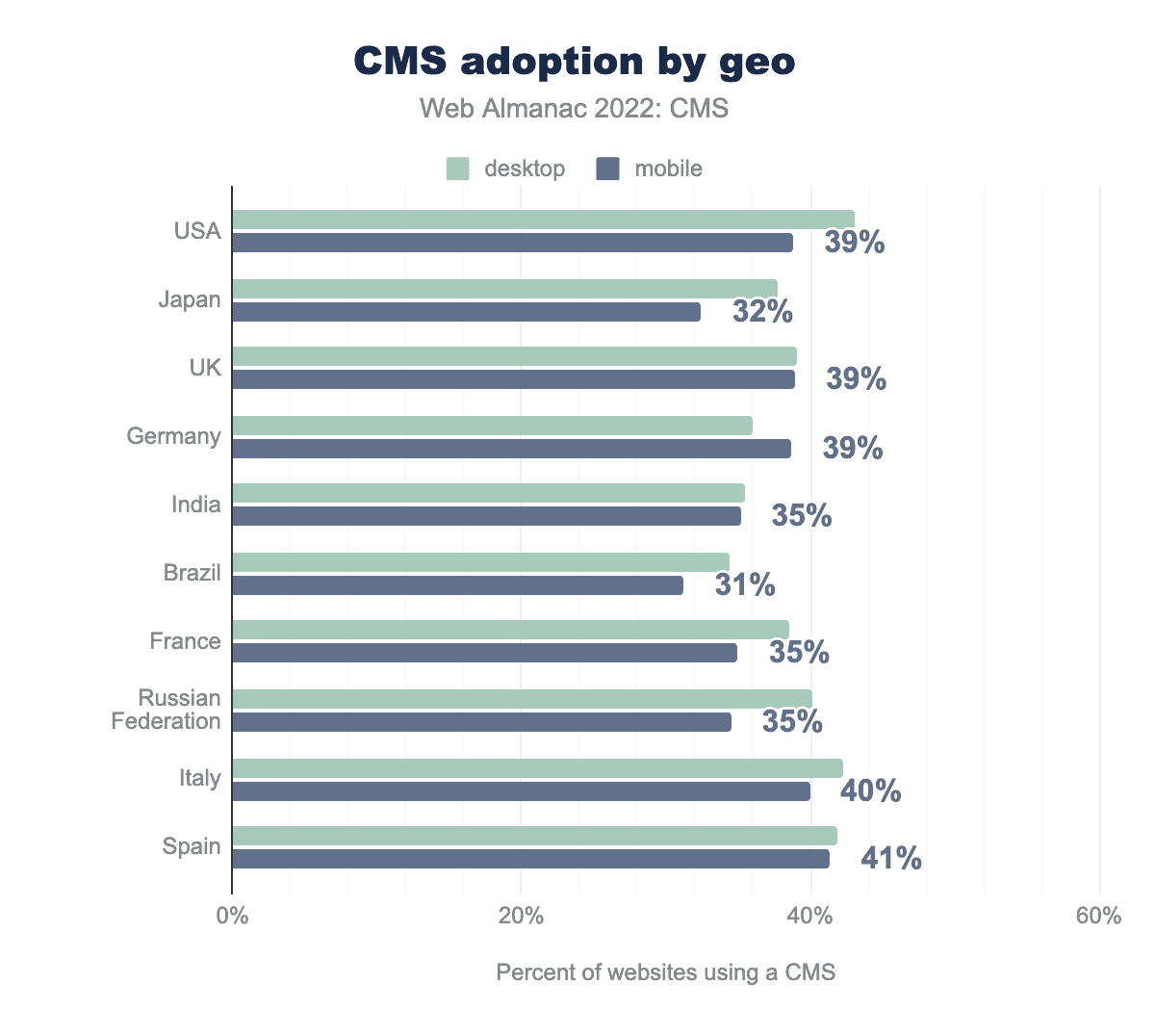 Among the countries with the highest number of websites, CMS adoption is highest in Italy and Spain where 40%–41% of mobile sites are built with a CMS. Brazil and Japan have the lowest adoption with only 31% and 32% respectively.