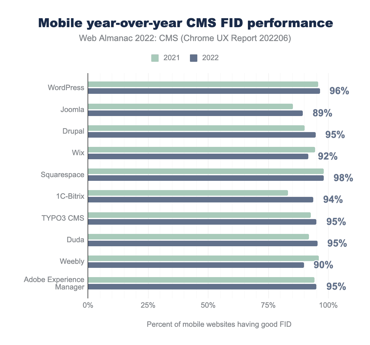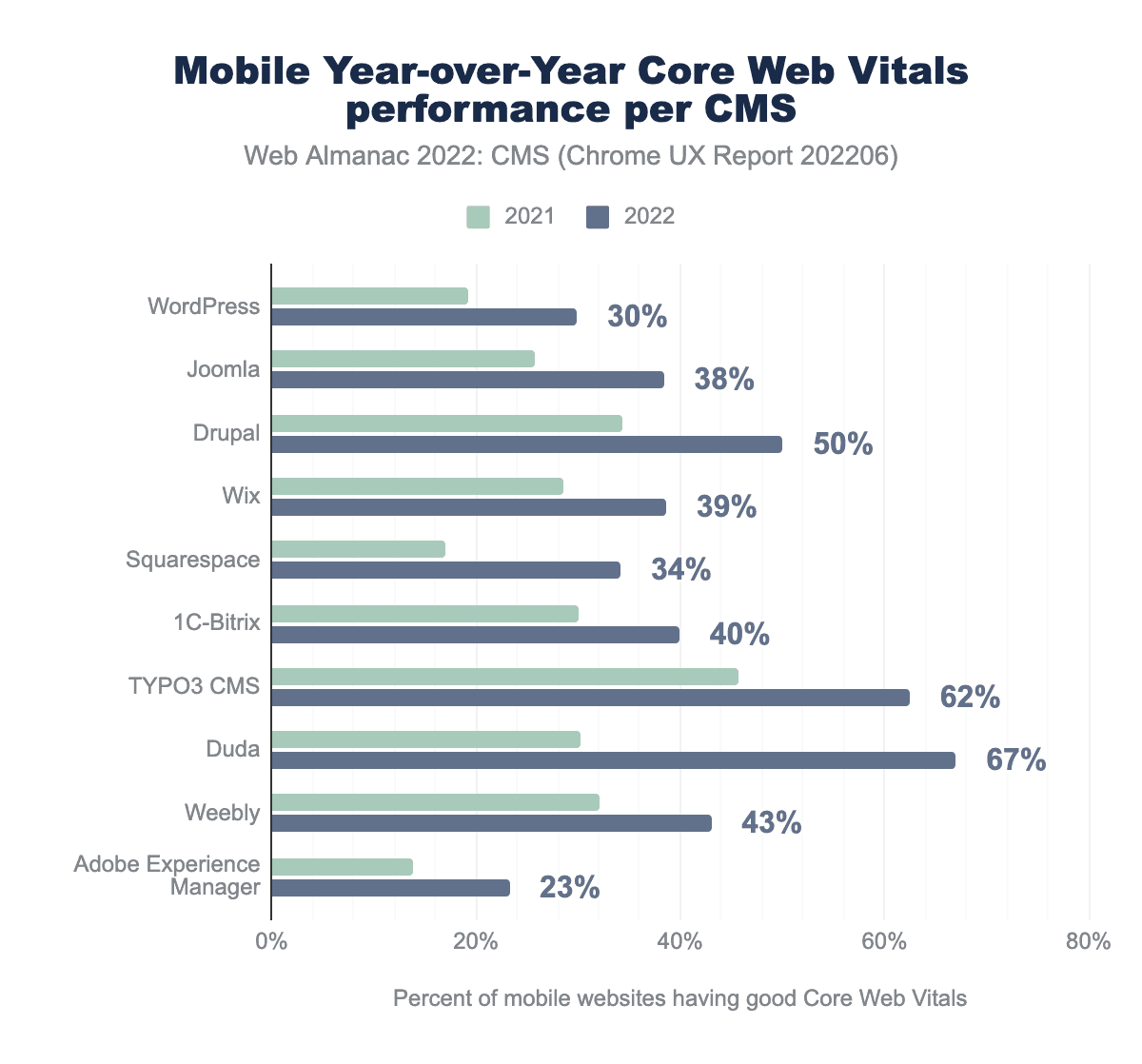 Comparing yearly data, we can see that all CMSs made progress. WordPress, Squarespace, Duda, and Adobe Experience Manager in particular show significant gains.