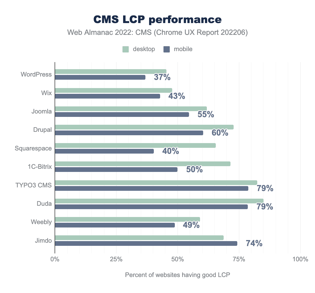 TYPO3 and Duda had the best LCP scores with 79% of origins having a “good” LCP experience. WordPress and Squarespace have the worst LCP scores with 37% and 40% of origins having good LCP scores, respectively.