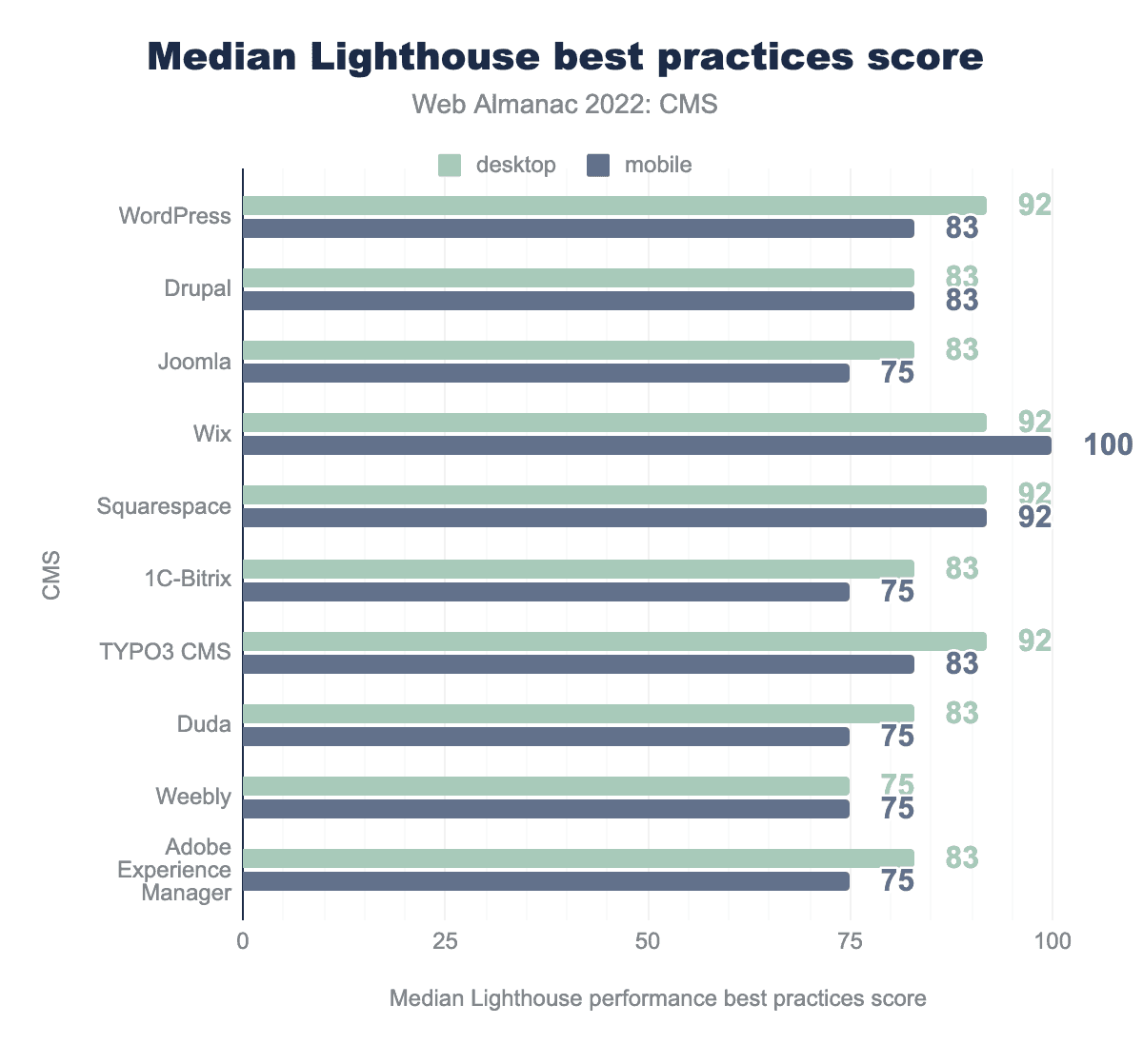 Wix had the highest median best practices score of 100, while many of the other top 10 platforms share the lowest score of 75. Again, desktop results are very similar though larger in some cases. This may reflect incorrect image aspect ratios on mobile pages since most of the other audits in this category are platform-based.