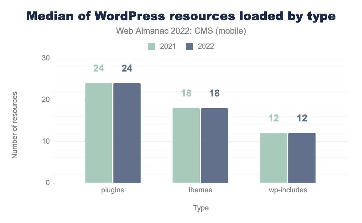 We explored how WordPress sites use external resources and separated them into resources that are included in plugins, themes, and shipped in WordPress core (wp-includes) with comparison to our 2021 results.