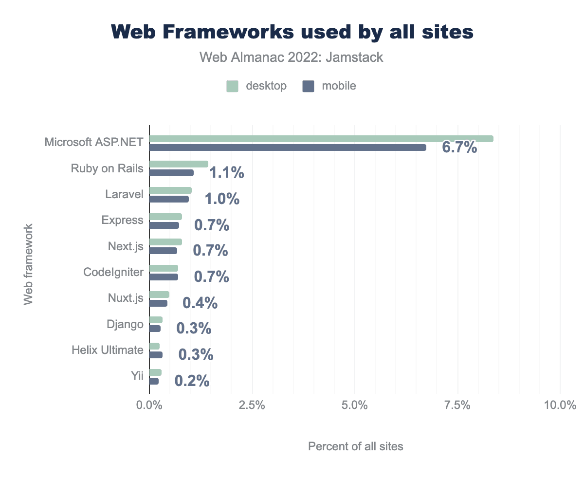 A great question here is: why are Next.js and Nuxt.js considered web frameworks, but Vue.js and React considered JavaScript frameworks? But leaving that aside, you can see that Microsoft’s ASP.Net framework is extremely popular across the web as a whole, and so is stalwart Ruby on Rails. What does it look like in the Jamstack?