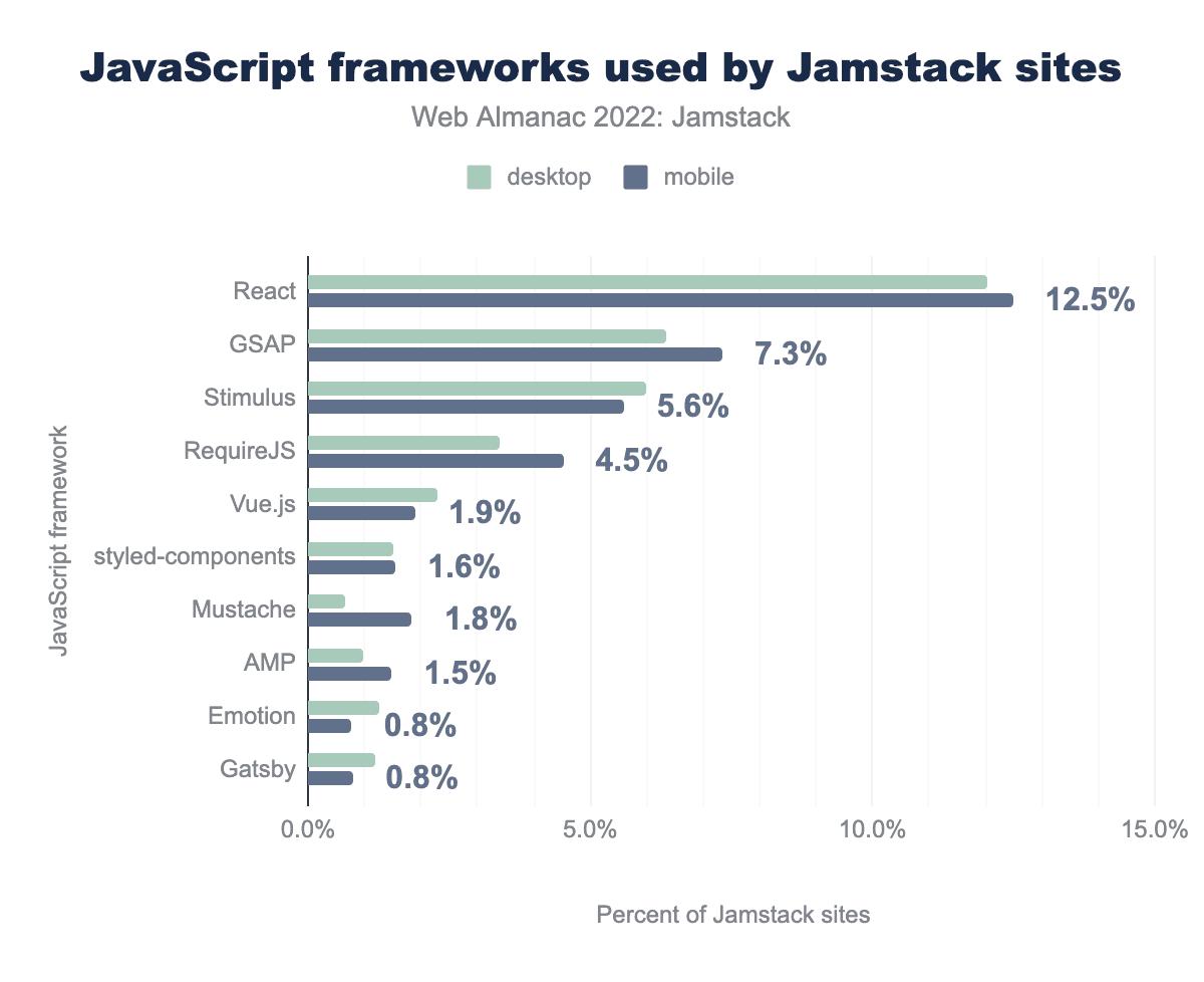Despite all these caveats, we think this year’s estimate of “Jamstack-y” sites is an improvement over a strictly SSG-focused definition and gives a better sense of where the web really is today, which is after all the goal of the Almanac.