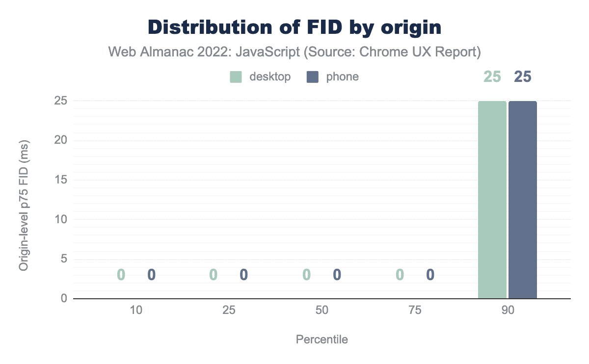 As was the case last year, this year marks yet another increase in the amount of JavaScript shipped to browsers. From 2021 to 2022, an increase of 8% for mobile devices was observed, whereas desktop devices saw an increase of 10%. While this increase is less steep than in previous years, it’s nonetheless the continuation of a concerning trend. While device capabilities continue to improve, not every one is running the latest device. The fact remains that more JavaScript equates to more strain on a device’s resources.