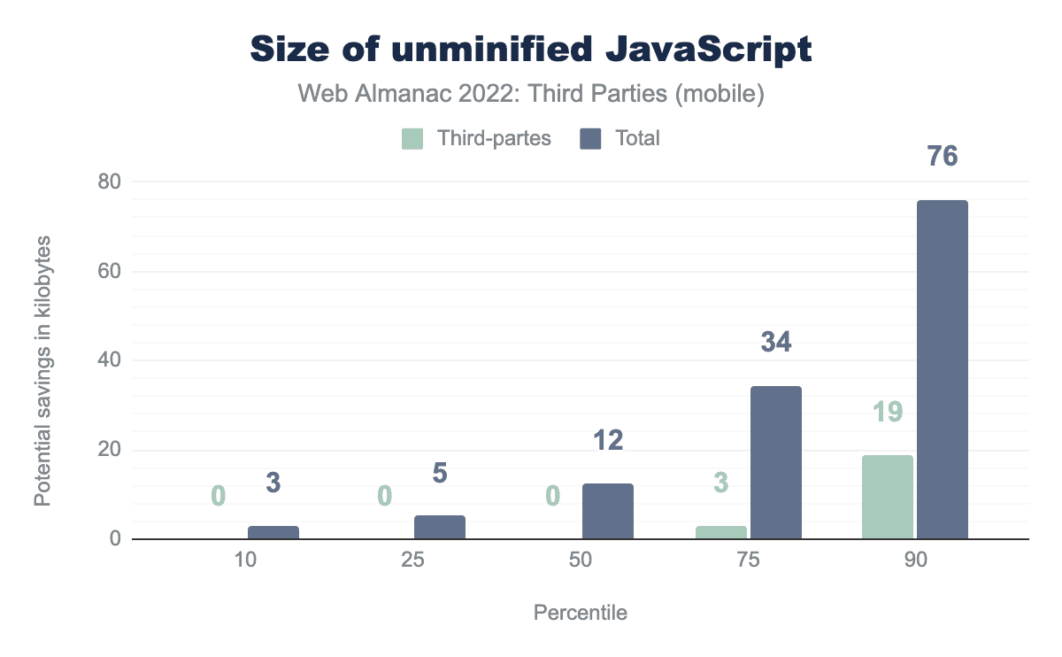 According to Lighthouse, the median mobile page loads 162 KB of unused JavaScript. At the 90th percentile, 604 KB of JavaScript are unused. This is a slight uptick from last year, where the median and 90th percentile of unused JavaScript was 155 KB and 598 KB, respectively. All of this represents a very large amount of unused JavaScript, especially when you consider that this analysis tracks the transfer size of JavaScript resources which, if compressed, means that the decompressed portion of used JavaScript may be a lot larger than the chart suggests.