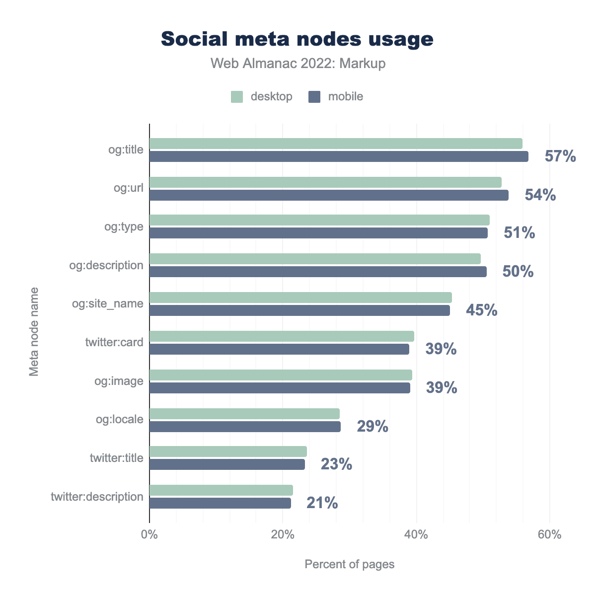 og:title is on 56% of desktop and 57% of mobile pages, og:url on 53% and 54% respectively, og:type on 51% and 51%, og:description on 50% and 50%, og:site_name on 45% and 45%, twitter:card on 40% and 39%, og:image on 39% and 39%, og:locale on 28% and 29%, twitter:title on 24% and 23%, and finally twitter:description on 21% of both.Do you need all of this metadata? That depends on your requirements. But if these requirements are about showing title, description, and image, you don’t seem to need nearly as much. You may be able to do with twitter:card, og:title, og:description (hooked up to standard description metadata), and og:image. The author and many others have described options for minimal social markup.