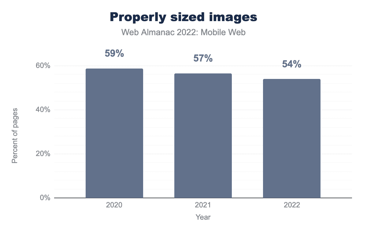 Given Google’s increased focus on rewarding good performance with their Core Web Vitals program, you would expect that more sites would be optimizing their images. However, it’s interesting to see that sites are actually having fewer optimized images over time. The figure above shows that there is a decrease in the percentage of pages with properly sized images since 2020, when 59% of sites had properly sized images. But in 2022, that number is down to only 54%.