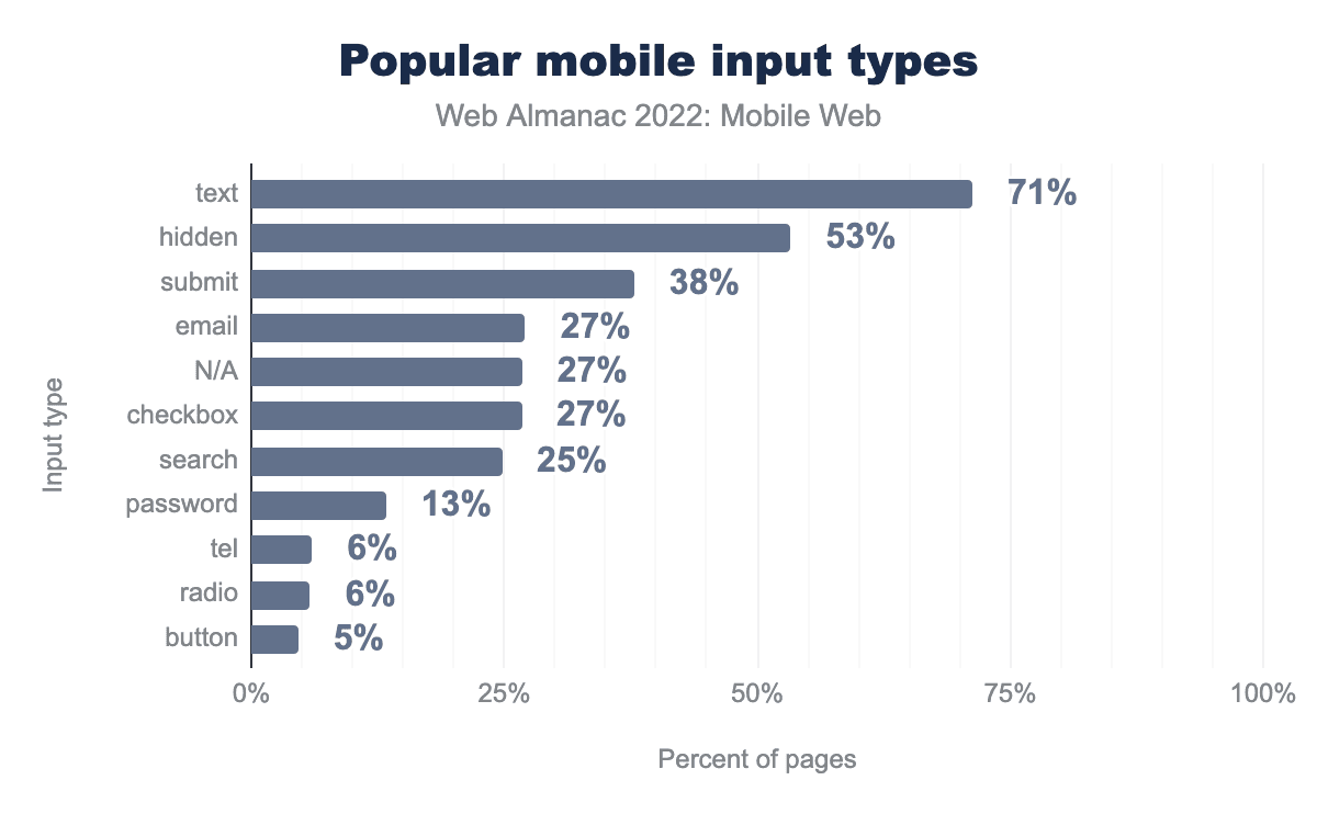 Since modulating keyboards with input fields is much more important on mobile than it is on desktop, we track the most popular mobile input types across their archive of websites. In 2022, text was still the most popular input type, used on 71% of pages, which is down slightly from last year at 73%. hidden was the next most common input type at 53% of pages, then submit at 38%.