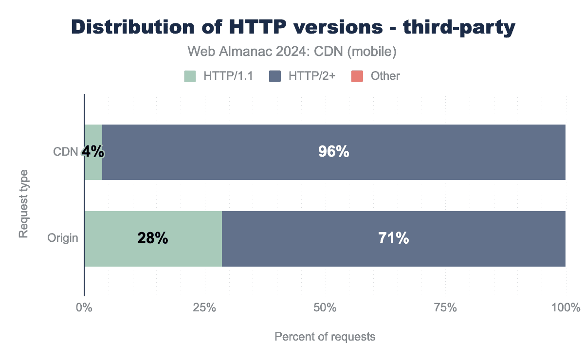 Overall compared to previous years, while CDNs continue to lead in the adoption of newer HTTP versions, in 2024 origin servers are beginning to catch up. This could be a result of the critical mass of CDN traffic already using HTTP/2+, but we look forward in future chapters to diving deeper into these trends as they unfold.