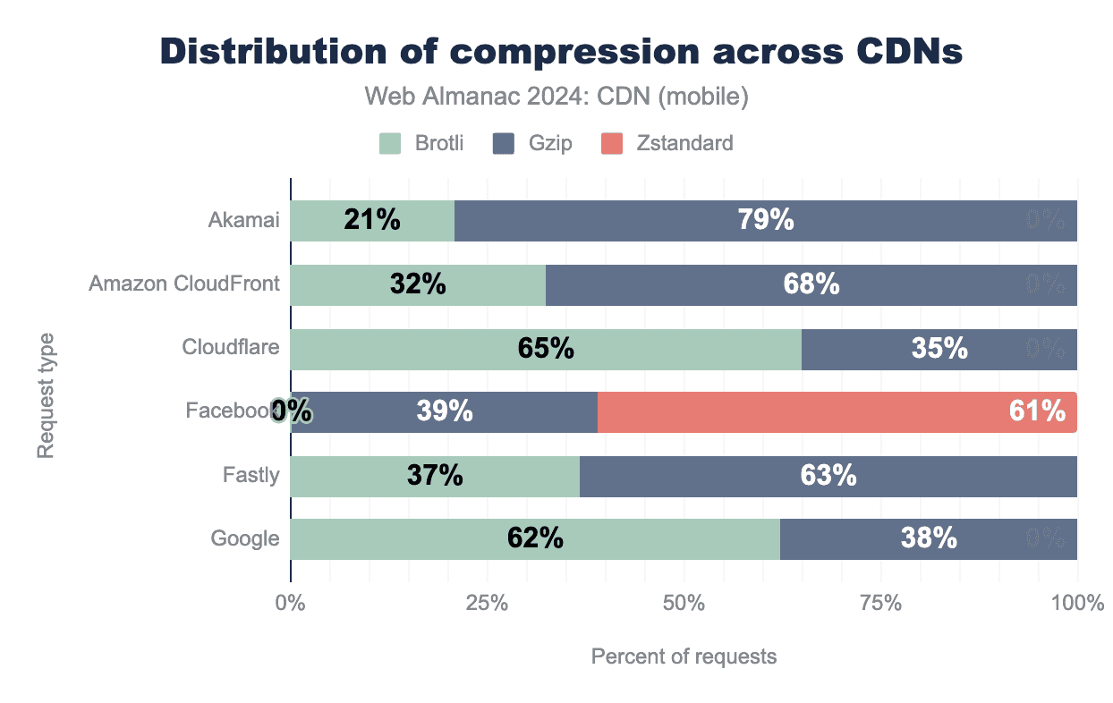 Brotli usage is prevalent on Cloudflare and Google CDNs while Gzip remains the majority across Akamai, Amazon CloudFront, and Fastly. However, when compared to 2022 Brotli continues its broad trend towards more adoption with larger CDN providers. The outlier in our dataset was Facebook which had over 60% adoption of Zstandard. Facebook’s strategy has been to optimize content delivery using their own compression algorithm so this result is expected.