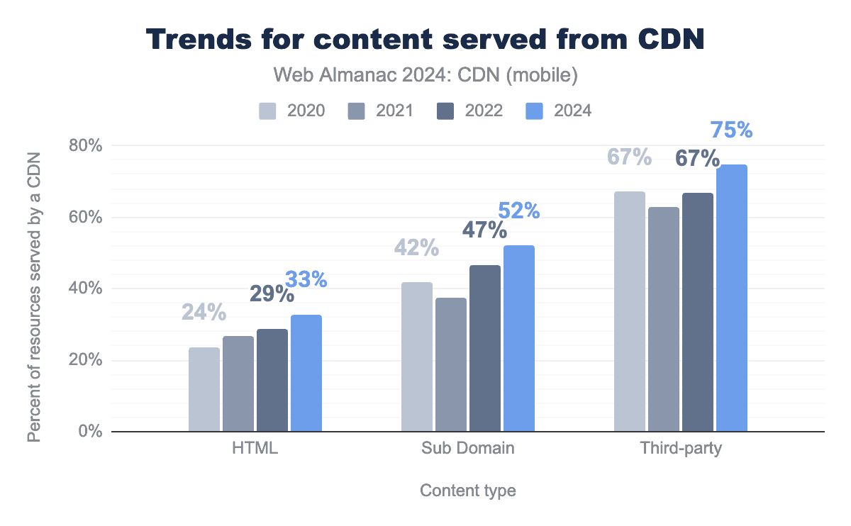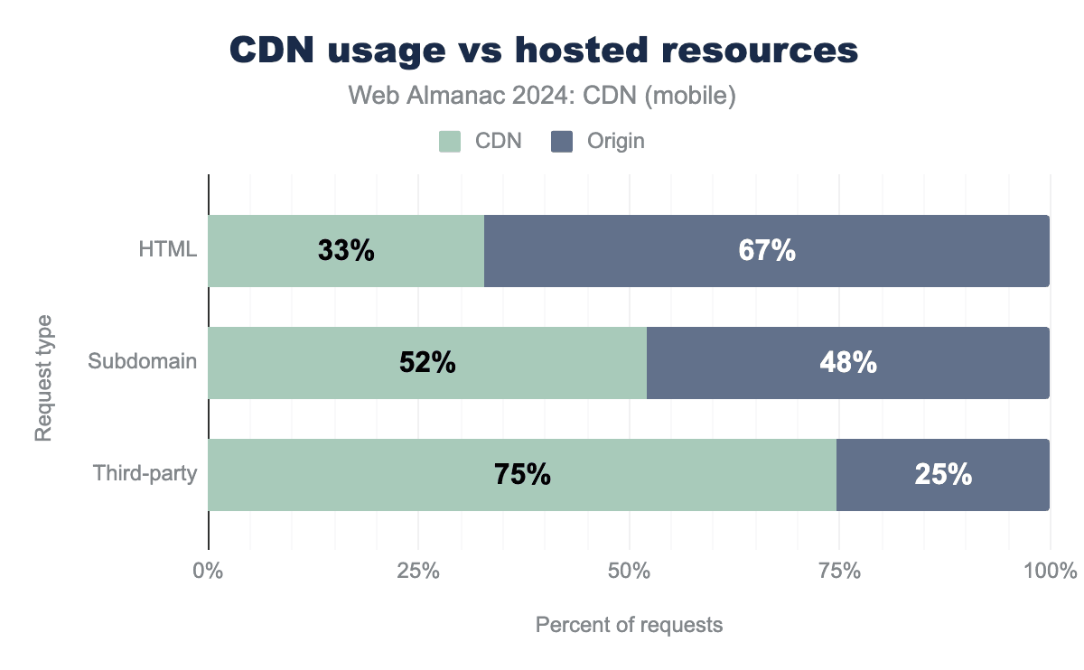 The chart above shows the breakdown of requests for different types of content (HTML, Subdomain, and Third-party), showing the share of content served by CDN versus origin on mobile devices (identical figures are observed for desktop).