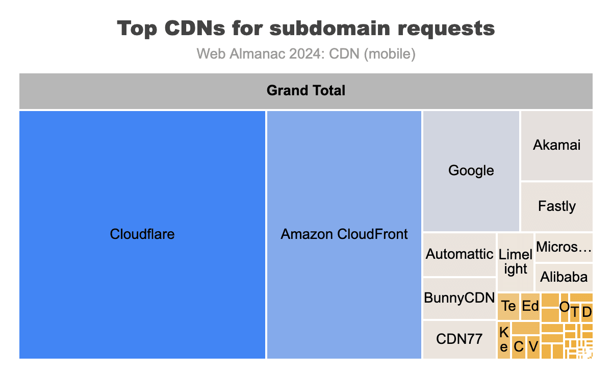 As with any observational study, there are limits to the scope and impact that can be measured. The statistics gathered on CDN usage for the Web Almanac are focused more on applicable technologies in use and not intended to measure performance or effectiveness of a specific CDN vendor. While this ensures that we are not biased towards any CDN vendor, it also means that these are more generalized results.