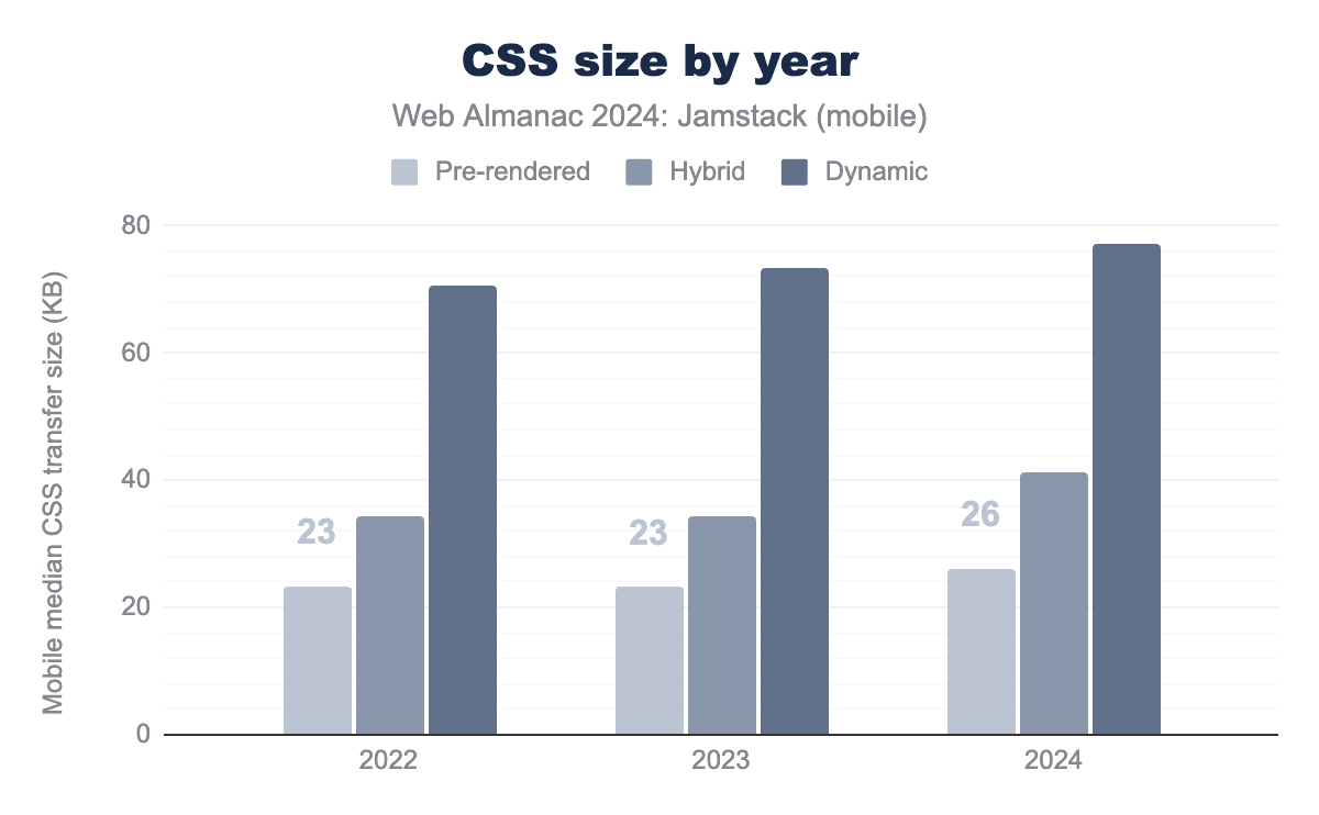 The total transfer of CSS provides another perspective and shows a slight upward trend across all categories. The notable jump between Hybrid and Dynamic sites stands out. While further analysis is needed to pinpoint the exact cause, a likely explanation is that Prerendered and Hybrid sites tend to be hand-crafted by web developers. In contrast, Dynamic sites often rely on themes, website builders, and plugins which are notorious for having bloated web assets.