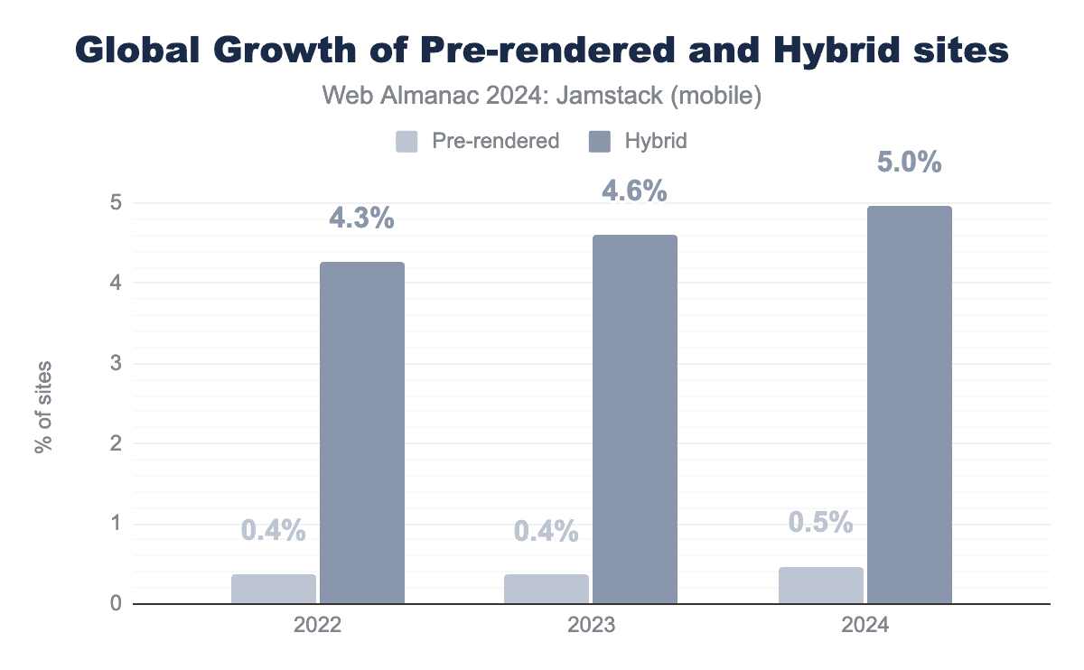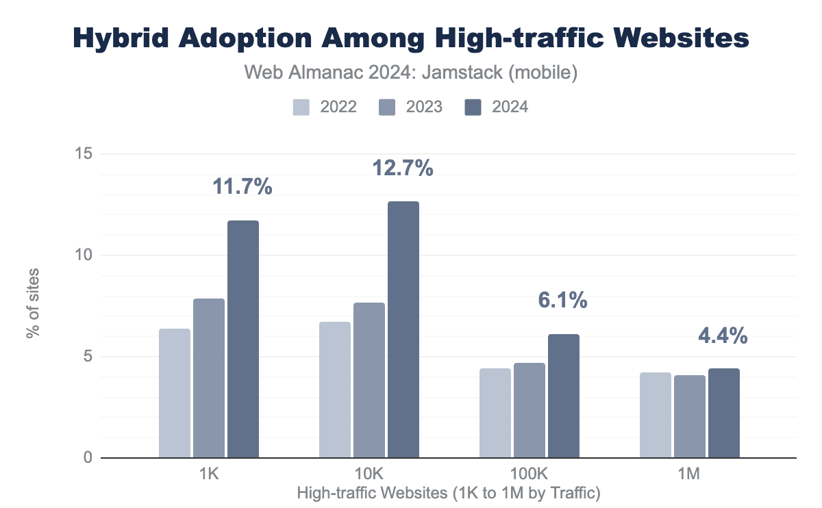 The standout this year is the combined 67% growth of Prerendered and Hybrid architectures in the top 10k high-traffic websites in 2024—over 12% of these popular sites now use these approaches. While Prerendering and Hybrid delivery remains niche in the context of the entire web, it’s rapidly gaining traction where its benefits are most valued.