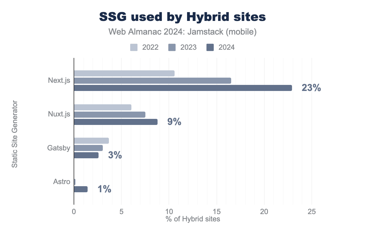 We see Next.js extending its lead in the Hybrid category with a 39% increase in the past year. Next.js is a highly flexible framework capable of Prerendering, Dynamic Rendering, and Incremental Static Regeneration (updating specific static pages on-demand without requiring a full site rebuild). Its versatility for everything from an information website to a fully-fledged web application is one of the big reasons we’re seeing its growing usage.