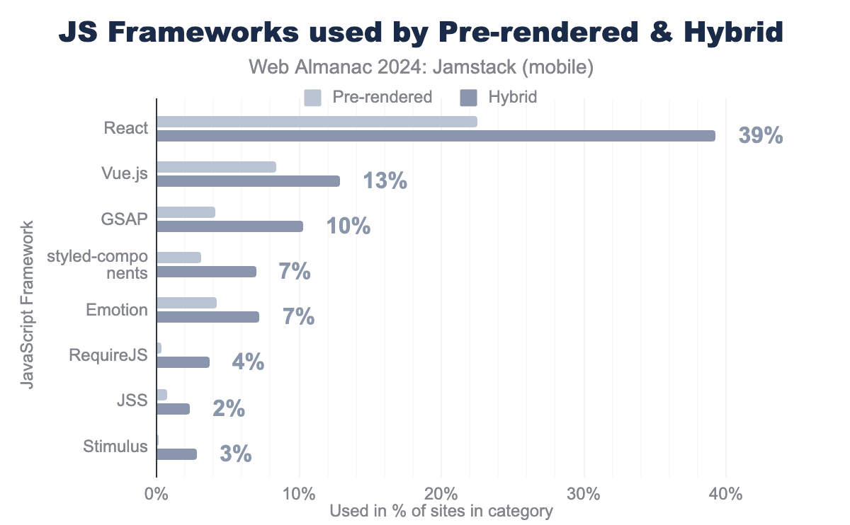 When we break down the JavaScript frameworks used by Prerendered and Hybrid websites, we see heavier frameworks like React are more commonly used in the Hybrid category.