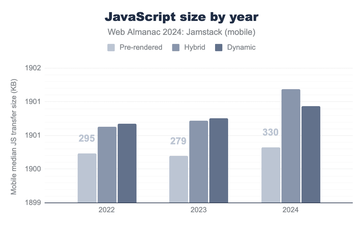 The total transfer of JavaScript offers one of the most interesting insights with a sharp increase in JavaScript size for Hybrid sites, surpassing that of the Dynamic category in 2024.
