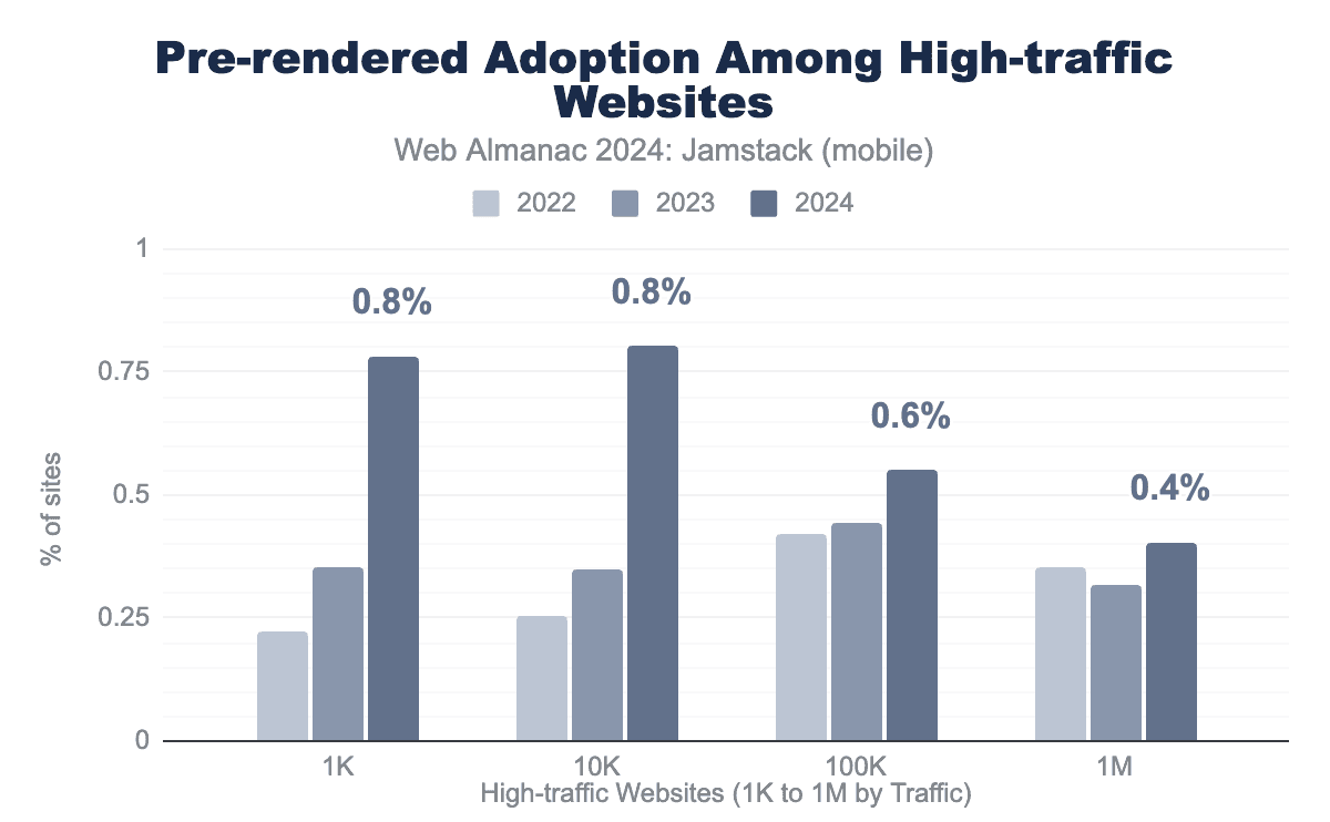 There’s been significant growth in Prerendered adoption among the top 1k and 10k most popular sites with growth leveling off at the 1M mark and beyond. These high-traffic sites care a great deal about performance, SEO, security, and stability, principles that align perfectly with the Prerendered approach.