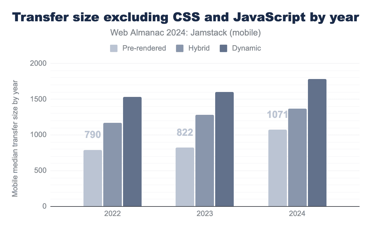 The jump between Prerendered and Hybrid sites likely reflects their different use cases with Prerendered sites more likely to be static, informational sites, while Hybrid sites might lean more into eCommerce and web applications which can lead to larger transfer sizes.