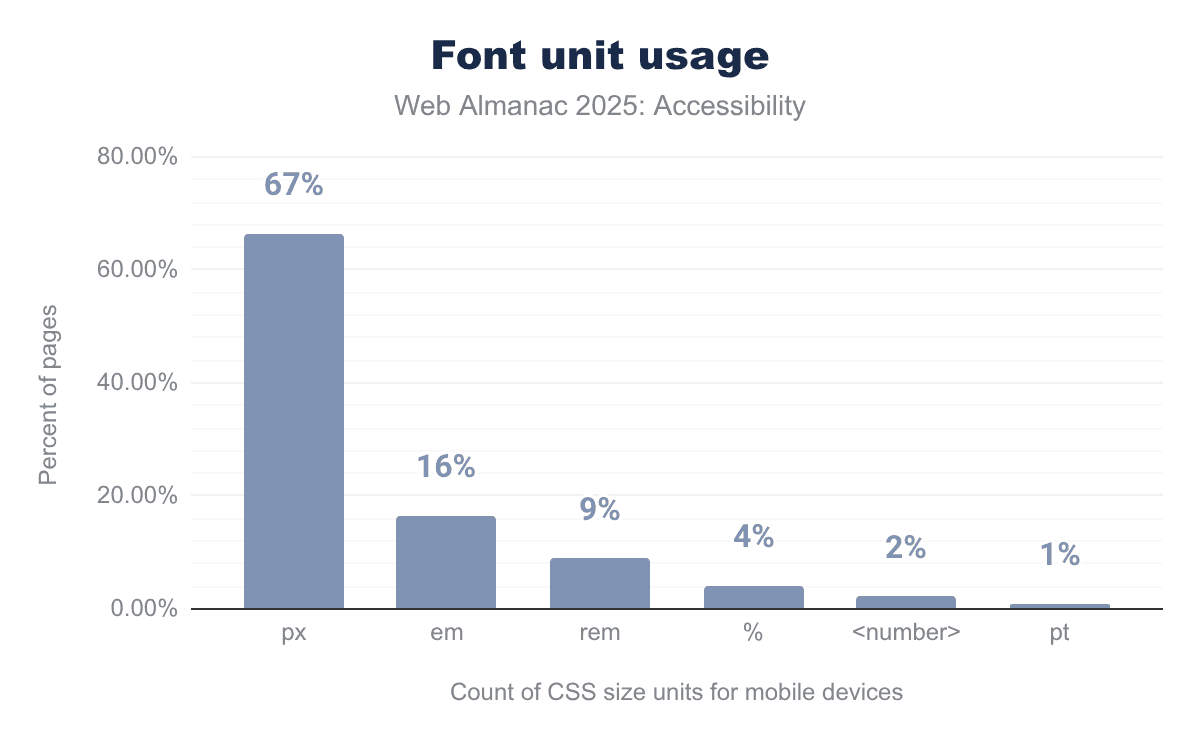 Font size units directly affect how text can respond to user preferences. Relative units, such as em and rem, let text to scale predictably with browser settings. In 2025, the use of em on mobile sites increased by 2%, improving user experiences for those who adjust font sizes to increase readability. Otherwise, font size unit usage stays largely the same as last year.
