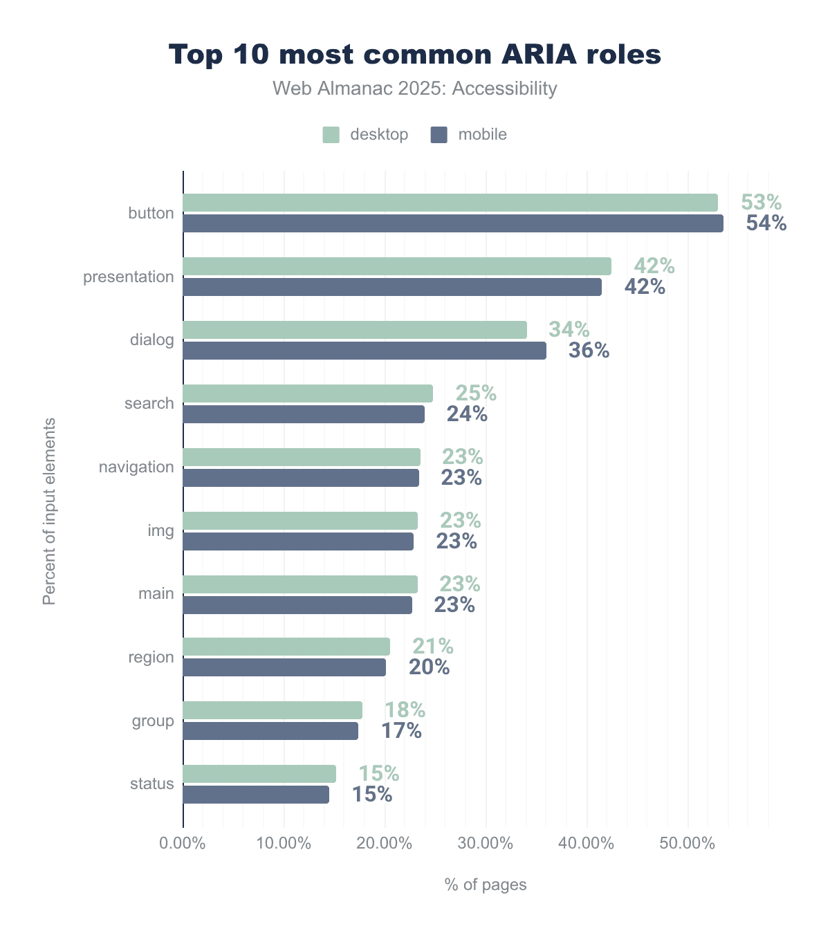In 2025, the adoption of ARIA landmarks has increased slightly, led by the growing use of the native <main> element, now at 47%, up 3% from 2024. This progress reflects better compliance with semantic HTML and more robust page structure for users relying on assistive tools.