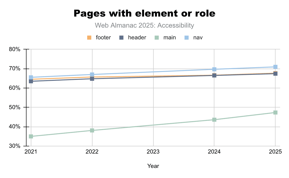 Continued education on leveraging native HTML5 landmarks and minimizing redundant ARIA roles will further improve keyboard and assistive technology navigation experiences. The growth in semantic structure adoption supports accessibility goals and aligns web content with modern best practices.