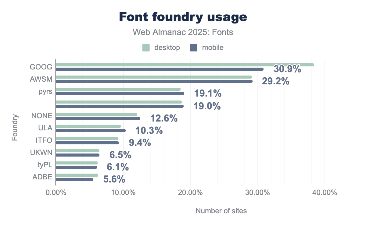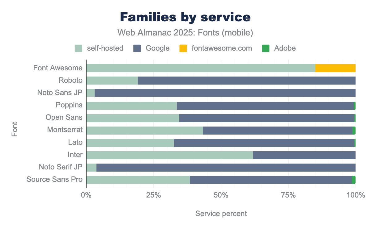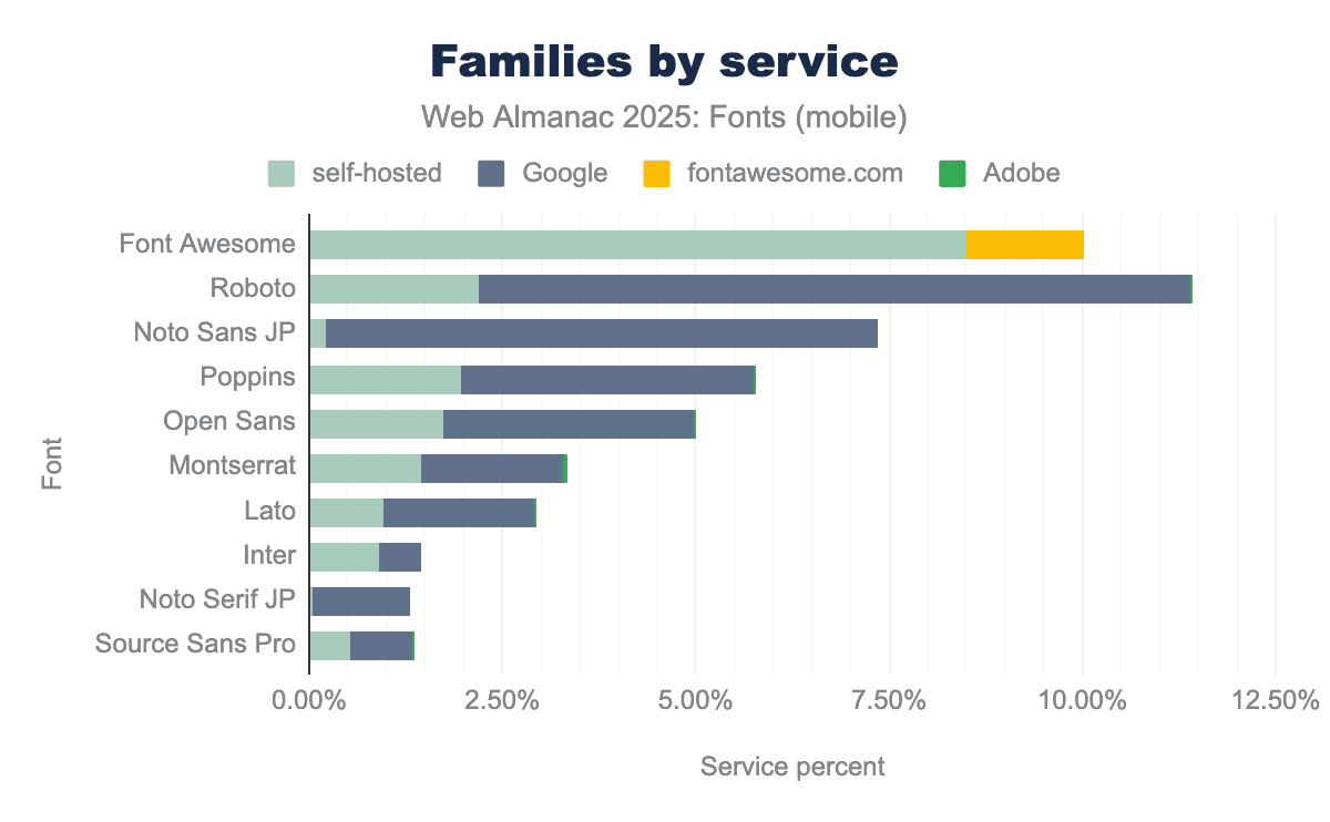 Every other service is essentially negligible at the web scale. Legacy services like Monotype’s Fonts.com, Extensis, Cloud.Typography, and Type Network each account for well under 1% of sites. Many of these have declined to the point of near-invisibility in our crawl data. In practical terms, if a website is using a hosted font service in 2025, it’s almost certainly Google Fonts. There’s a small chance it’s Adobe Fonts or Font Awesome, and very little chance that it’s something else.