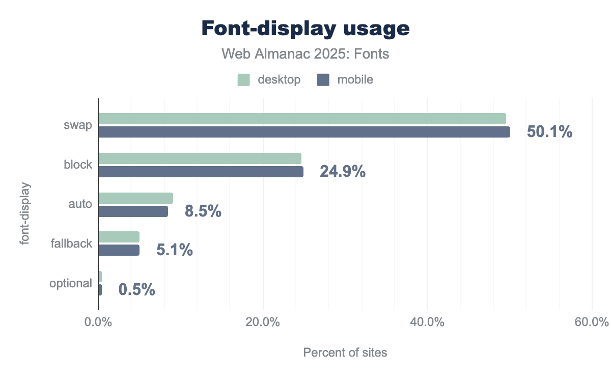 The most common choice is font-display: swap. It appears on about 49.6% of desktop pages and 50.1% of mobile pages in our 2025 crawl. In other words, about half of all pages using web fonts now specify font-display: swap for at least one font. This value ensures text is displayed immediately using a fallback font and then swapped to the web font when it finishes loading. The popularity of swap aligns with web best practices (it’s recommended by Google Fonts and many experts). Essentially, it’s now the default mindset for text content: developers prefer a quick first paint of text, even if it’s in a fallback font for a moment.