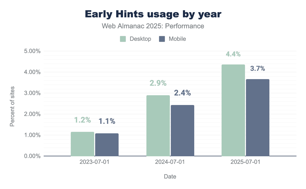 Early Hints are available via CDNs including Fastly since 2020, Cloudflare since 2021, and Akamai since 2023.