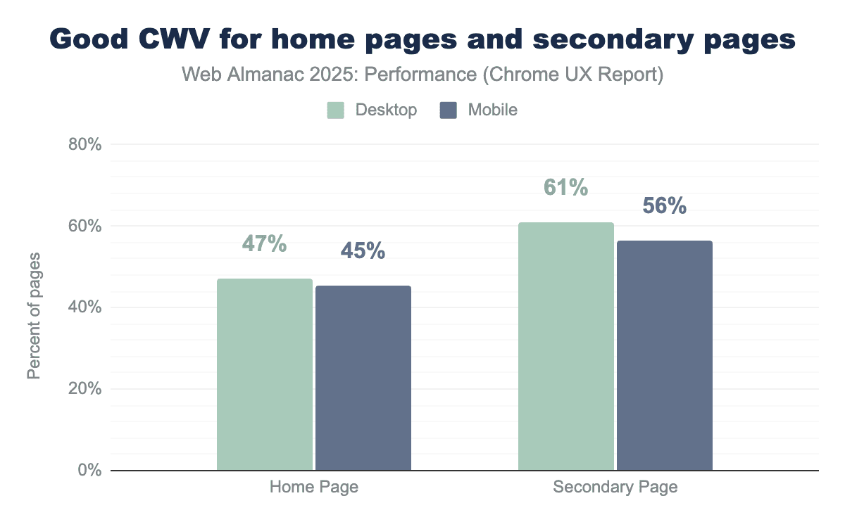 - Home pages now outperform secondary pages significantly (80% vs 69% on mobile).