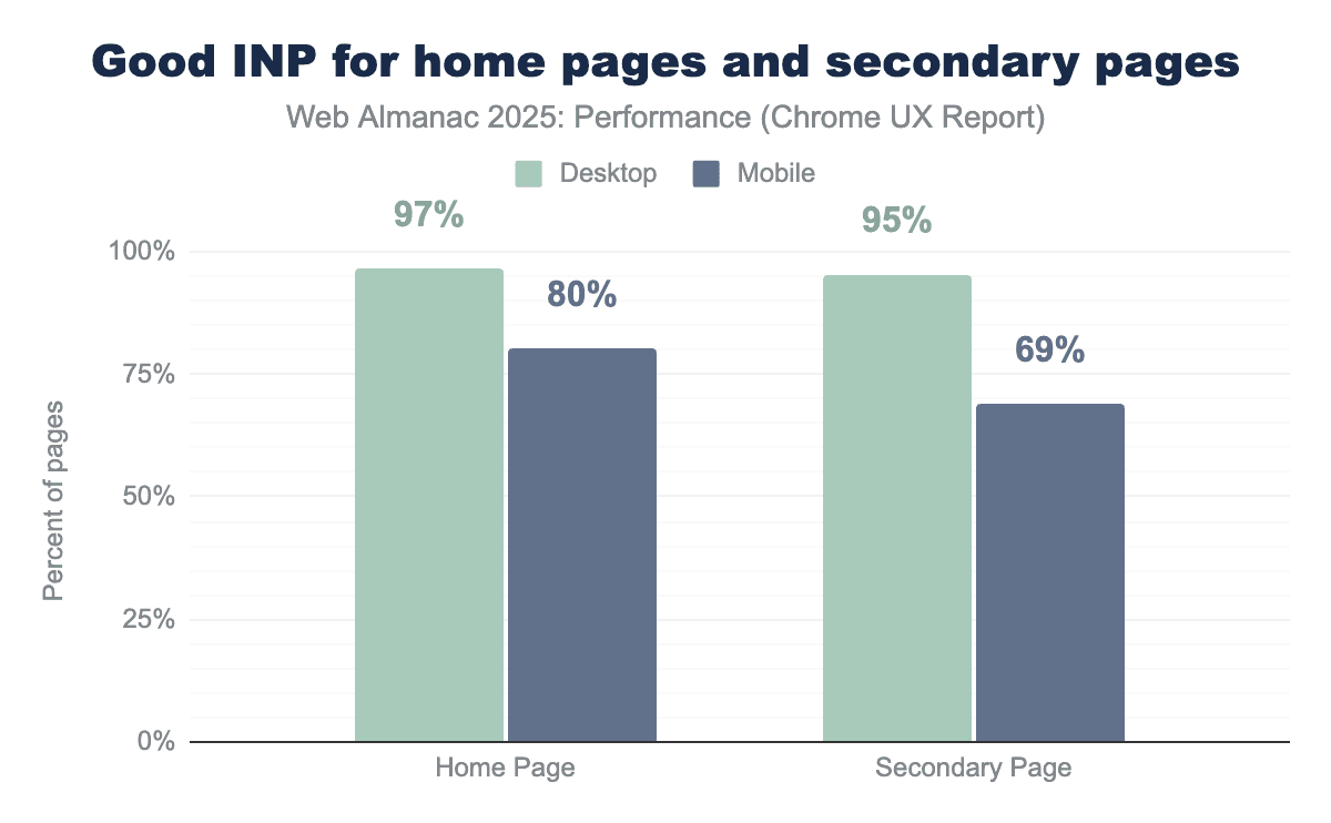 In a notable shift from 2024, home pages now demonstrate significantly better INP performance than secondary pages on mobile devices, when looking at page-level CrUX data. Mobile home pages achieved 80% good INP scores—a 7 percentage point improvement over 2024. Secondary pages declined to 69%, creating an 11 percentage point gap. This divergence represents a change from 2024, when home and secondary pages performed nearly identically (73% vs 72% on mobile). Desktop performance remained strong for both page types at 97% and 95% respectively.