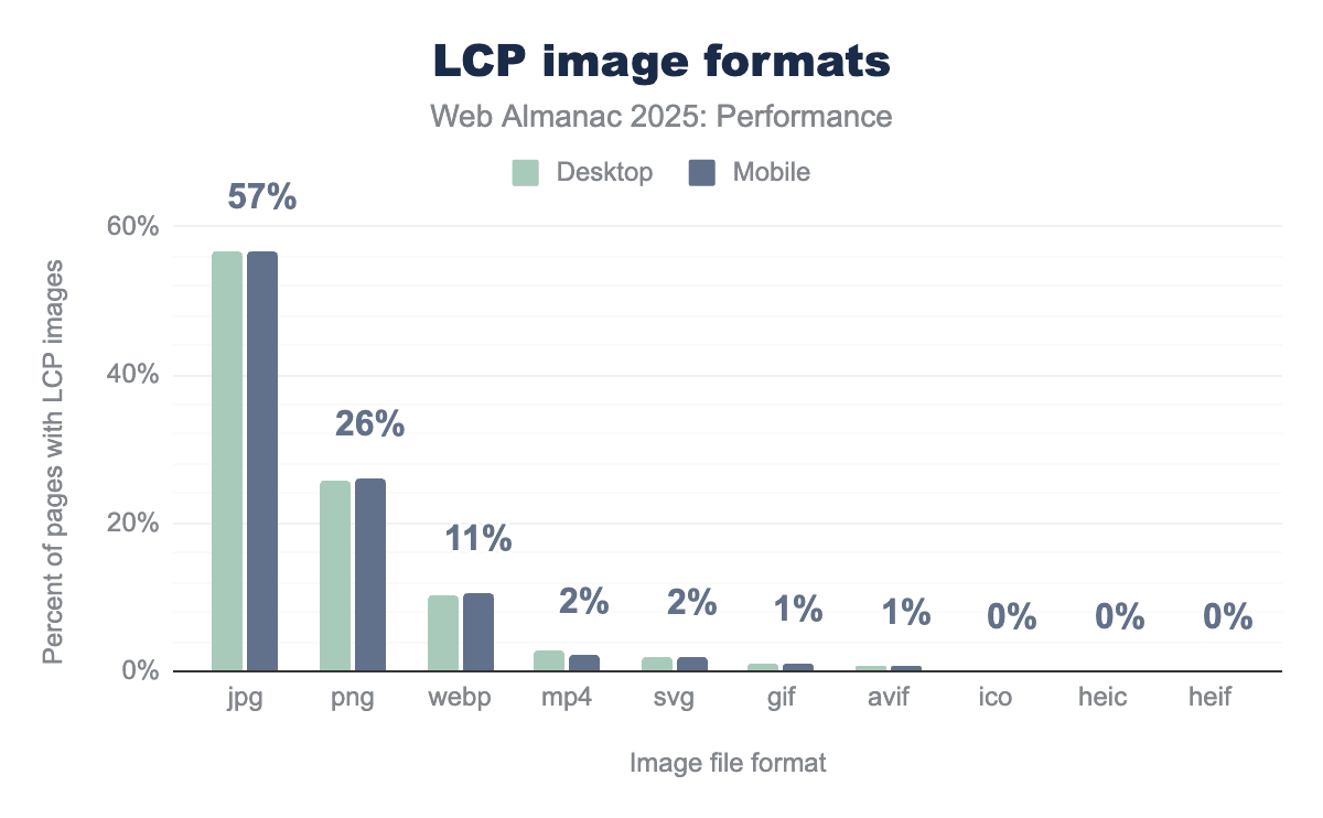There are some encouraging signs though, such as JPG usage has decreased by 4% since 2024 while WebP has increased by 4%.