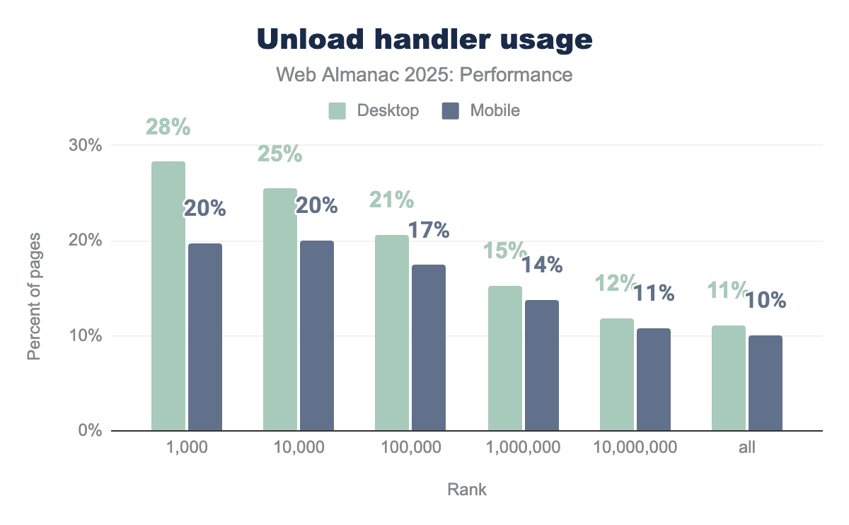 It is interesting to see that unload handler usage decreases consistently as site popularity decreases. Among higher-traffic websites (top 1,000 sites), unload handlers are present on 28% of desktop pages and 20% of mobile pages, and this share declines steadily across lower-ranked sites, reaching 11% on desktop and 10% on mobile. At every rank, desktop pages exhibit higher unload handler usage than mobile, suggesting that unload handlers remain more common on larger, more complex sites than across the long tail of the web. Possibly due to top sites relying more heavily on analytics, advertising, and legacy lifecycle patterns that register unload handlers.